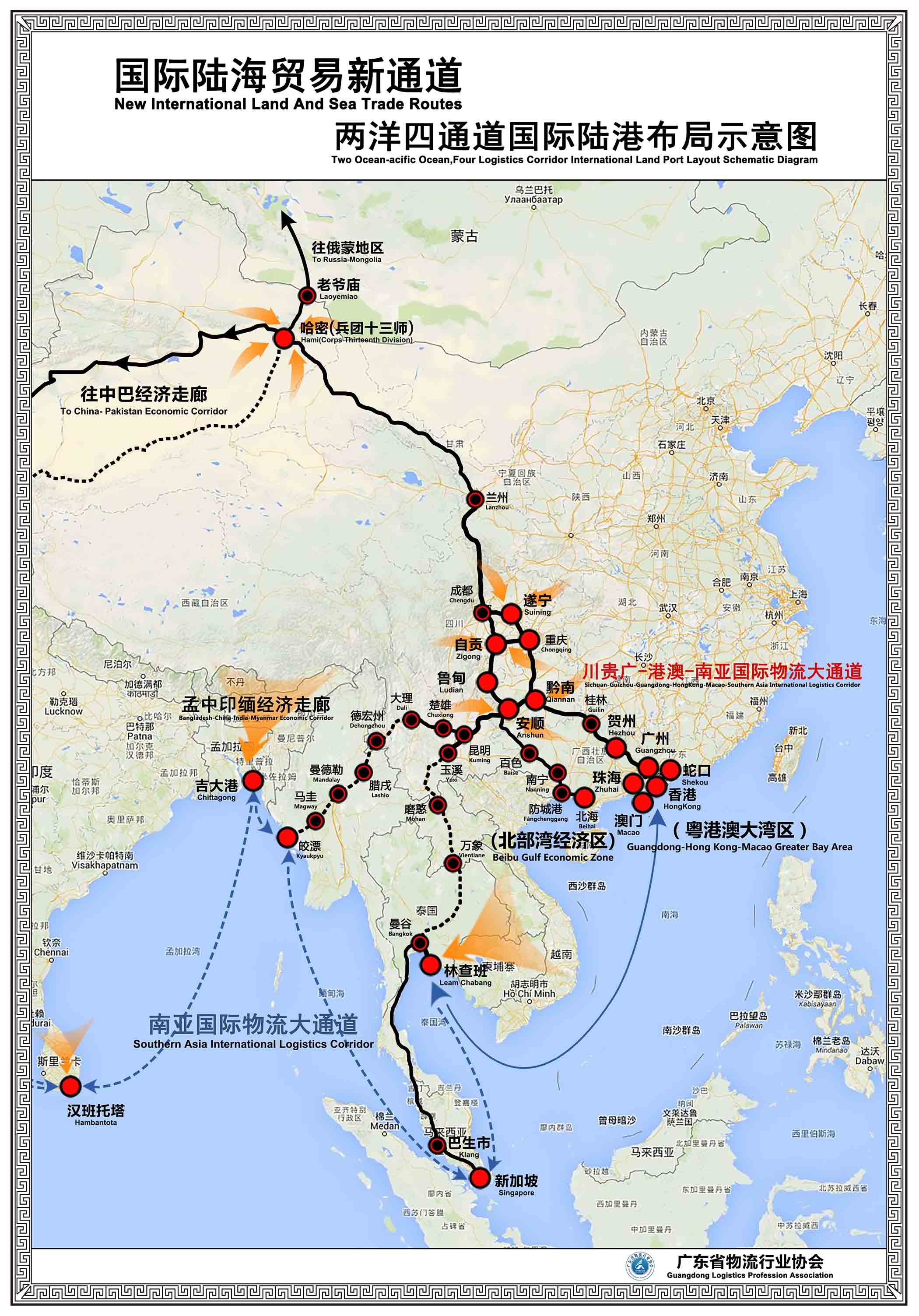 國際陸海貿易新通道 兩洋四通道國際陸港布局示意圖